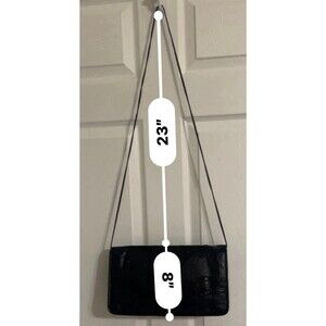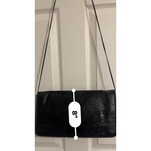 This is a black patchwork exotic skin and leather shoulder bag with a long, versatile handle, allowing it to be carried like a crossbody or can be tucked in, converting it into a clutch.