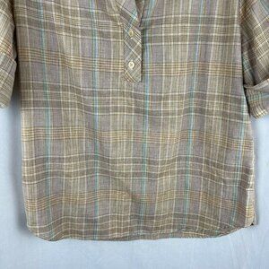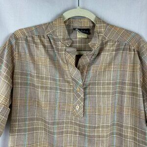 Vintage 80s Carousel Plaid Shirt Women Large Brown Popover Short Sleeve Retro