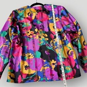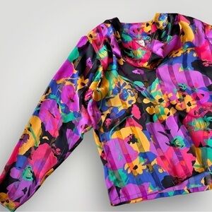 Vintage Carry Back 80s vibrant jewel tone floral cowlneck popover blouse. Semi-sheer with satin and thin gold tone stripes. Features small shoulder pads. Great pre-loved condition.