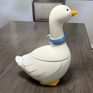 Adorable goose-shaped cookie jar featuring a blue bow and floral accents. Perfect for adding a whimsical touch to your kitchen.