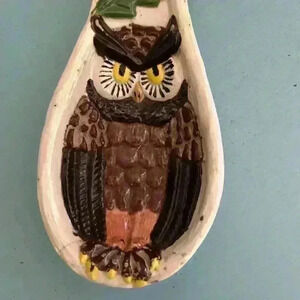 Hand painted vintage ceramic spoon rest features an owl with oak leaves and acorns. Old school kitsch for your kitchen wall, there's even a small hole on the back for hanging. Pull it down to use as a spoon rest while making meals, clean, and hang again to store it out of the way.