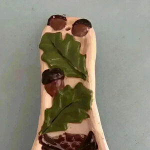 Hand painted vintage ceramic spoon rest features an owl with oak leaves and acorns. Old school kitsch for your kitchen wall, there's even a small hole on the back for hanging. Pull it down to use as a spoon rest while making meals, clean, and hang again to store it out of the way.