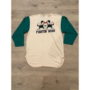 Authentic vintage 1980s Champion henley-style raglan shirt featuring Notre Dame text on the chest and graphic Fighting Irish Logo on back. Classic cream body with green sleeves and three-button neckline. Made in the USA from a soft and durable 50/50 cotton-poly blend.