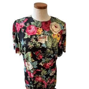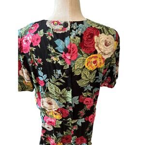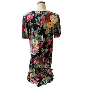 Vintage 80s Charter Club by Jane Justin Dark Floral print Rayon Maxi Dress, size 8. Good preowned condition, featuring a dark rose floral pattern on a black background, short sleeves, back button detail. Note skirt has belt loops but no belt. 100% rayon