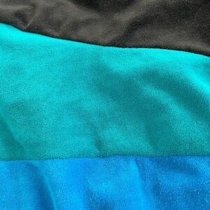 Vintage 80s Cherry Hill velour two-piece tracksuit set including a black, teal and blue geometric color block top with crewneck and knit trim at the neck, hem and cuff. The shirt measures 23 inches shoulder to him and 23 inches armpit to armpit. The pants are pull on and taper slightly towards the ankle measuring 12 inches straight across the waist when fully relaxed stretching to 15 inches without much resistance.29 inches