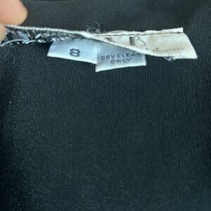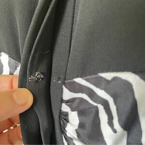 Black sheath dress with zebra print panel. Zebra panel is ruched by front button placket. Hidden button down front. Long sleeves with large button at cuff. Shoulder pads, could be removed.