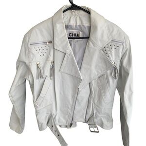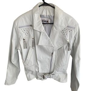 Vintage 80s Chia Moto Embellished Fringe Rocker Coat white Leather Jacket Large