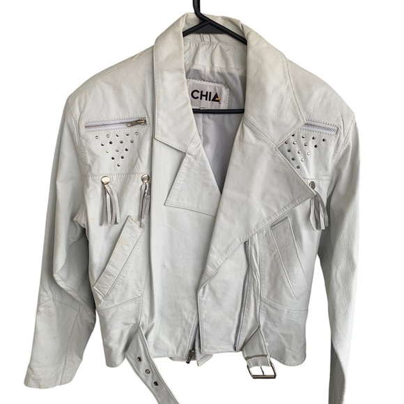 Vintage 80s Chia Moto Embellished Fringe Rocker Coat white Leather Jacket Large