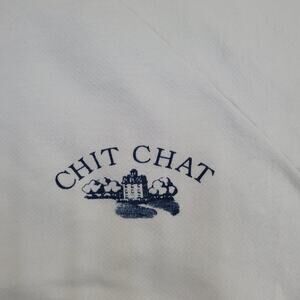 CHIT CHAT POLO SHIRT, VINTAGE EMBROIDERED POLO, RETRO COTTAGECORE STYLE, MINIMALIST EMBROIDERY DESIGN, WHITE EMBROIDERED SHIRT, CLASSIC POLO STYLE, VINTAGE CASUAL WEAR, EMBROIDERED CHIT CHAT LOGO, 90S INSPIRED POLO SHIRT, CLEAN MINIMAL VINTAGE