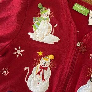 Vintage 80s Christmas CAT Full Zip Embroidered Sweater Size Petite Large Snowman