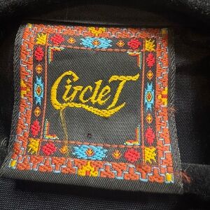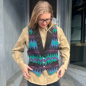 Statement 1980s Circle T wool-blend vest featuring a vivid turquoise, purple, and black southwestern geometric pattern. Trimmed in black corduroy lapels for that classic western-tailored contrast and finished with buffalo-nickel-style buttons down the front. Fully lined in acetate for a smooth fit.