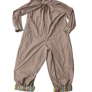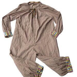 Handmade clown suit in a brown and white graph pattern with contrasting cuffs in bright stripes. Comes with classic sailor / red yarn cap from Pony Express, made in the USA. Generous sizing, please check measurements: Armpit to armpit 24" Neck to crotch 35" Inseam 22" Smoke free, pet free MADE IN THE USA