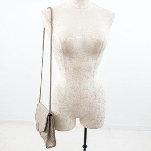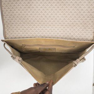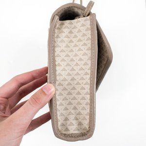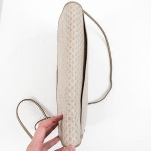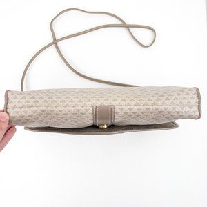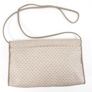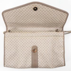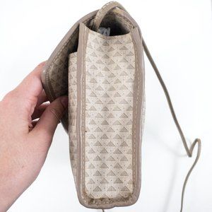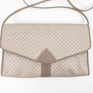 Vintage 80s triangle geometric print envelope crossbody bag. Dark & light tan taupe grey coated canvas (like Louis Vuitton) w leather trim. Convenient outside pocket. Clasp has slight wear due to age. Tuck strap for a big clutch. Nice clean neutral look & water resistant, so it's great for parties or everyday. EUC AS-IS.