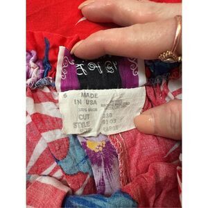 Red base color with purple and blue tropical floral print and white palm prawn design