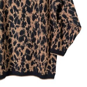 Features: crewneck, ribbed trim, shoulder pads, long sleeves, relaxed fit, acrylic blend knit with metallic gold thread detailing, leopard pattern in black and brown.