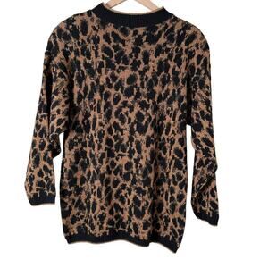 Vintage 80s Crewneck Leopard Pullover Knit Sweater Black Brown Metallic Gold, Size Large