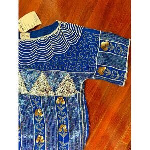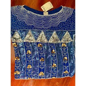 Vintage 80’s D & A Deadstock Silk Blue Silver Beaded Dress Formal Blouse Medium