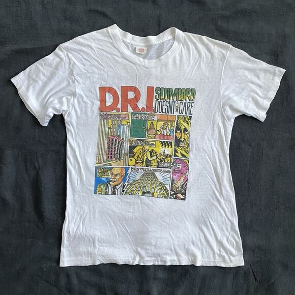 Vintage 80s D.R.I. Slumlord Doesn’t Care T Shirt L White Hardcore Punk Thrash