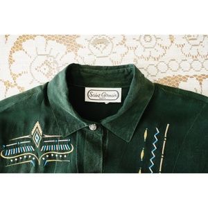Vintage Saint Germain Paris Dark Green Embroidered Long Sleeve Button Down Shirt est. Large Extra Large, very good vintage condition--no rips, stains, or holes, made in USA, point collar, velcro shoulder pads, long sleeves, single button cuff at vent, button down front, silver, gold, and turquoise abstract geometric embroidery at chest, straight hem, dark green washed woven self, fabric content is partly torn off--rayon, 18" across shoulders, 23.75" pit to pit, 27" shoulder to hem, 24.5" sleeve