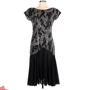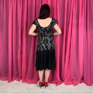 Catch some eyes with this vintage 80s beauty. Dress designed by Wayne Diamond, Diamonds Run. Black body with glitter pattern over body. Silky lower skirt. Has a wide neck, lower back, and shoulder pads. I was wearing a bra in pics and it didn't show. Waist is 16.5” across laid flat, and there is ample stretch.