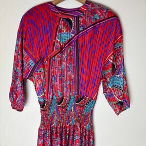 Vintage 80s Diane Freis Georgette Pleated Boho Maxi Gypsy Dress. Multicolor, multi patterned fabric with signature, pleated skirt, wide elastic waistband, crewneck with asymmetrical bodice opening with three buttons, dolman sleeves, shoulder pads, elastic on arms holes no longer has stretch. Tag states: 100% polyester / Georgette / CA 17529 / RN 62928. No size/ one size, seems like a large.