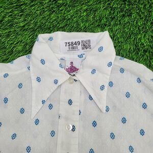 Step back in time with this vintage 80s disco hippie polka-dot shirt. Made in the USA, perfect for retro fashion lovers!