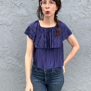 Retro early 80s disco top. Blue off the shoulder or wear up. Pleated crepe detail. Some light pulls on fabric. See close ups.