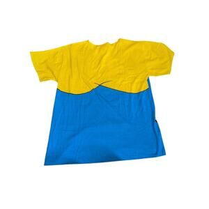 Bright and colorful primary color shirt with blue and yellow color blocking. A huge graphic print of Minnie and Mickey are on the front hugging each other. This would be perfect to wear to Walt Disney World or Disneyland. No one will have anything like it.