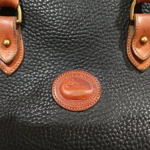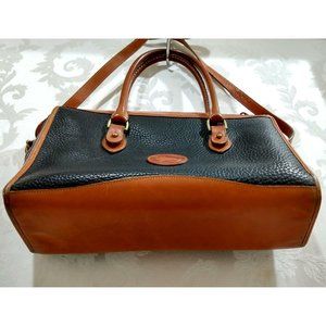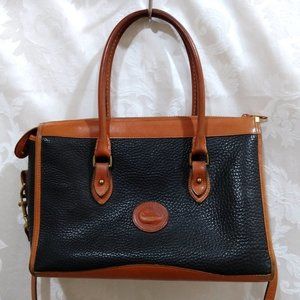 A Dooney & Bourke shoulder satchel purse, featuring black pebbled leather with chestnut brown leather trim. Vintage from the 1980s! Offers generous storage space and versatile design; called a "shoulder satchel" as the handles are deep enough that you can carry the bag on your shoulder using them rather than the shoulder strap. Both shoulder strap and handles are optionally removable.