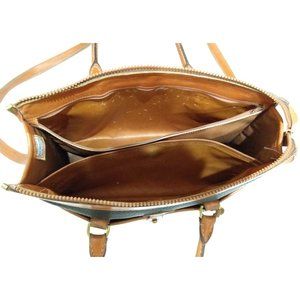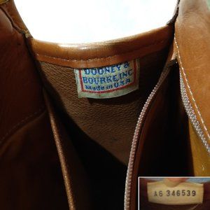 Handles have 6" drop length, shoulder strap has 19" drop length. Inner red, white, and blue "Dooney & Bourke Made in USA" sewn-in cloth tag with serial number (A6 346539) on the back. Approximately 12.5" length x 9" height x 4" width. Some light wear from normal usage, please see last five photos for closeups.