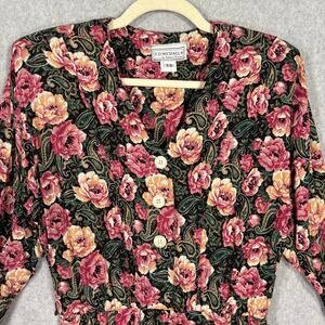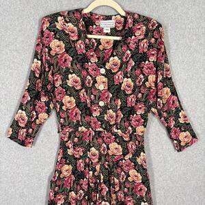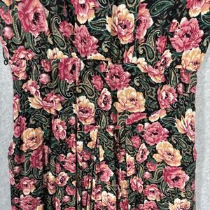 Vintage ED Michaels by Melanie Drucker 80s Dress Size 9 10 Pink Green Floral Midi Pleated Cottage 90s Retro Shoulder Pads Zipper Corp Career Work Office Business Church 3/4 Sleeve Modest Pockets