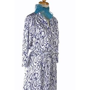 * Special Features: comes with original belt, white with blue loop pattern, long sleeves, elastic waist, the sheer blue scarf that was with the dress is included