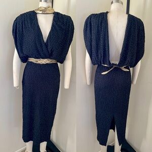 Vintage Contempo Casuals 1980s Dynasty Open Back, Plunging Neckline, stretch body con, power shoulders Black and Gold polka dot Women's Dress with gold lame belt.