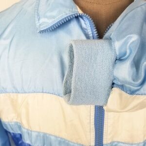 Vintage 80's. Sky blue with a white stripe in the middle and a darker blue at the bottom of the jacket. Cut typical of the 90s, with wider sleeves, ribbed cuffs and waist. The cuffs are knitted. Zippered with the Ellesse logo. Two pockets on the front, also with zippers. Ellesse logo embroidered on the front. Inside lined with white material.