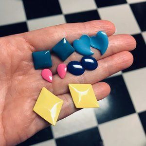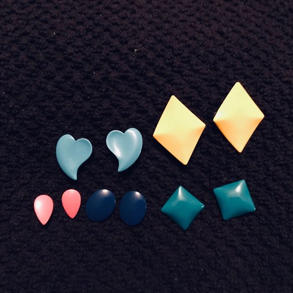 Lot/Bundle of 5 pair of vintage dainty 80's Metal Enamel Earrings. Great assortment of colors and shapes. Colors are yellow, Blue, Light Blue, Pink and Green. Shapes in heart, teardrop, diamond, oval and square.