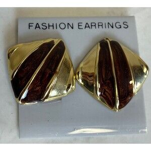 Vintage 80s Earrings Square Gold-tone Brown Faux Tiger Eye Pierced New Career
