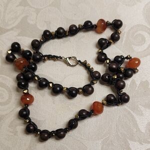 This captivating necklace showcases a harmonious blend of large, dark beads and vibrant orange elements, creating a striking contrast. The organic texture of the dark beads complements the bold, chunky orange pieces, making it a standout accessory. Perfect for adding a touch of color and style to any ensemble. In very good condition.