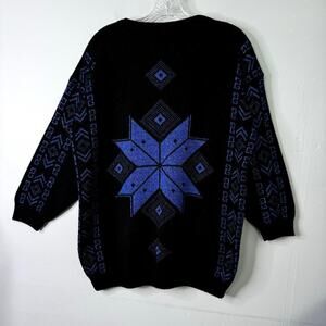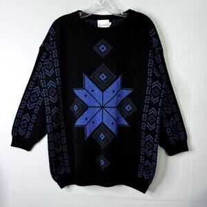 Vintage 80's Ellen-D Kollection Metallic Blue Snowflake Sweater Women's Size L. Black crew neck sweater with blue metallic sparkle snowflake pattern sweater. 3/4 length slouchy sleeves with drop shoulder construction. Relaxed fit.