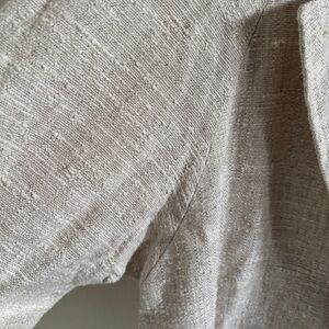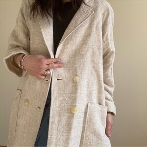 Materials tag is missing but it feels like a nubby linen tweed. Lined. Double breasted. Pockets. Lightly padded shoulders give a nice structure. 80s.