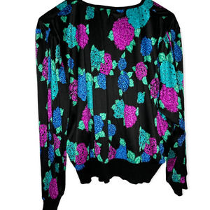 Vintage 80s Eve Simons Black Floral Purple Blue Teal Crepe Blouse Med Large Boho