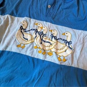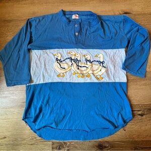 Keywords: vintage duck shirt, cottagecore henley, whimsical animal print top, retro countrycore, 1980s, 1990s, novelty graphic tee, Fast Ball