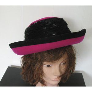 This is absolutely stunning in real life. This is fuchsia pink with black velvet trim and gorgeous black feathers. This style would probably be called a fedora. It's got a wide brim but not too wide.