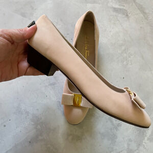 Elegant vintage Salvatore Ferragamo Vara pumps in soft blush pink suede nubuck — the iconic old-money classic. Featuring the signature grosgrain bow with gold Ferragamo logo plate, rounded toe, and stacked block heel for timeless ladylike polish. Made in Italy craftsmanship with luxurious materials and refined silhouette, these are the epitome of quiet luxury and feminine sophistication.