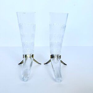 Sitting at a little over 9" tall, and held upright by clip on removable brass feet. One "made in finland" sticker remains on one of the glasses. The other glass does have a small chip on the rim.