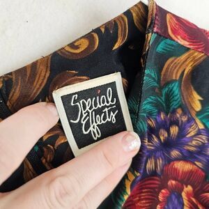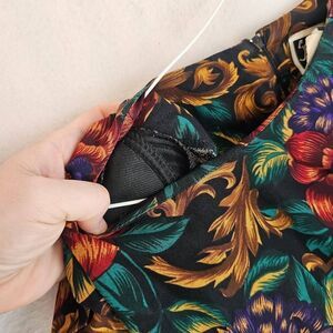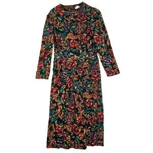 Crew neck, long sleeves, a-line silhouette. Rear zipper. Red, blue, green, gold florals over black. Padded shoulders.