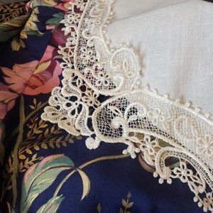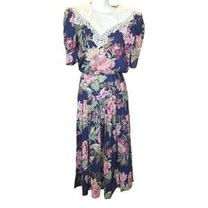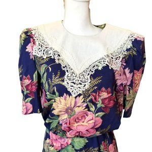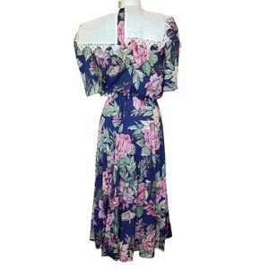 Vintage 80s Floral Blue Blouson Midi Dress Exaggerated Collar Cottage Core Small