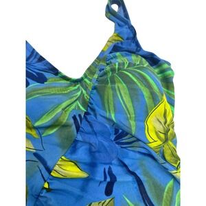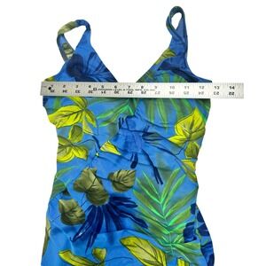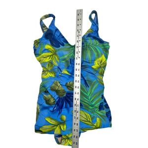Vibrant one-piece swimsuit featuring a bright and colorful floral and tropical leaf print. This swimsuit has a flattering V-neck design and ruched detailing at the bust. The all-over print includes shades of blue, green, and yellow, creating a lively, summery vibe. The design provides moderate coverage and a flattering skirt front. No issues to note. Size 10 C/D on the tag.