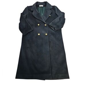 Features 80s vintage Forecaster 100% pure wool dark emerald green trench coat, long sleeve, 2 front slash pockets, fully satin lined, long pea coat, double breasted collar, v-neck with modesty button, 4 front gold buttons, dry clean only, classic timeless aesthetic, upper east side, celebrity style.