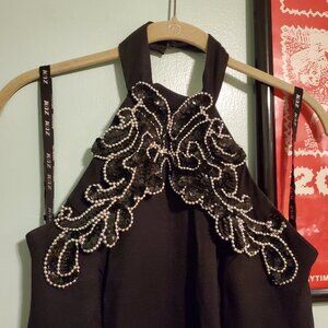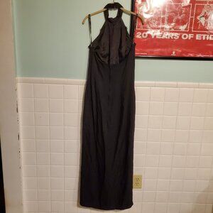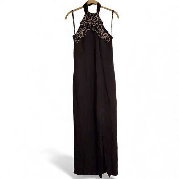 Vintage 80s Formal Black Sequin Halter Neck Side Slit Maxi Dress Goth Retro Glam