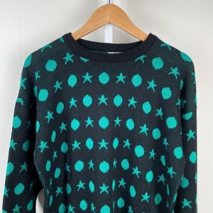 Women's vintage 1980's Fortune Knits, Inc. black and green geometric circle and star pattern crewneck sweater. No size on the tag. 100% acrylic. Made in USA. Great condition! Measurements: 23" armpit to armpit. 29" length.